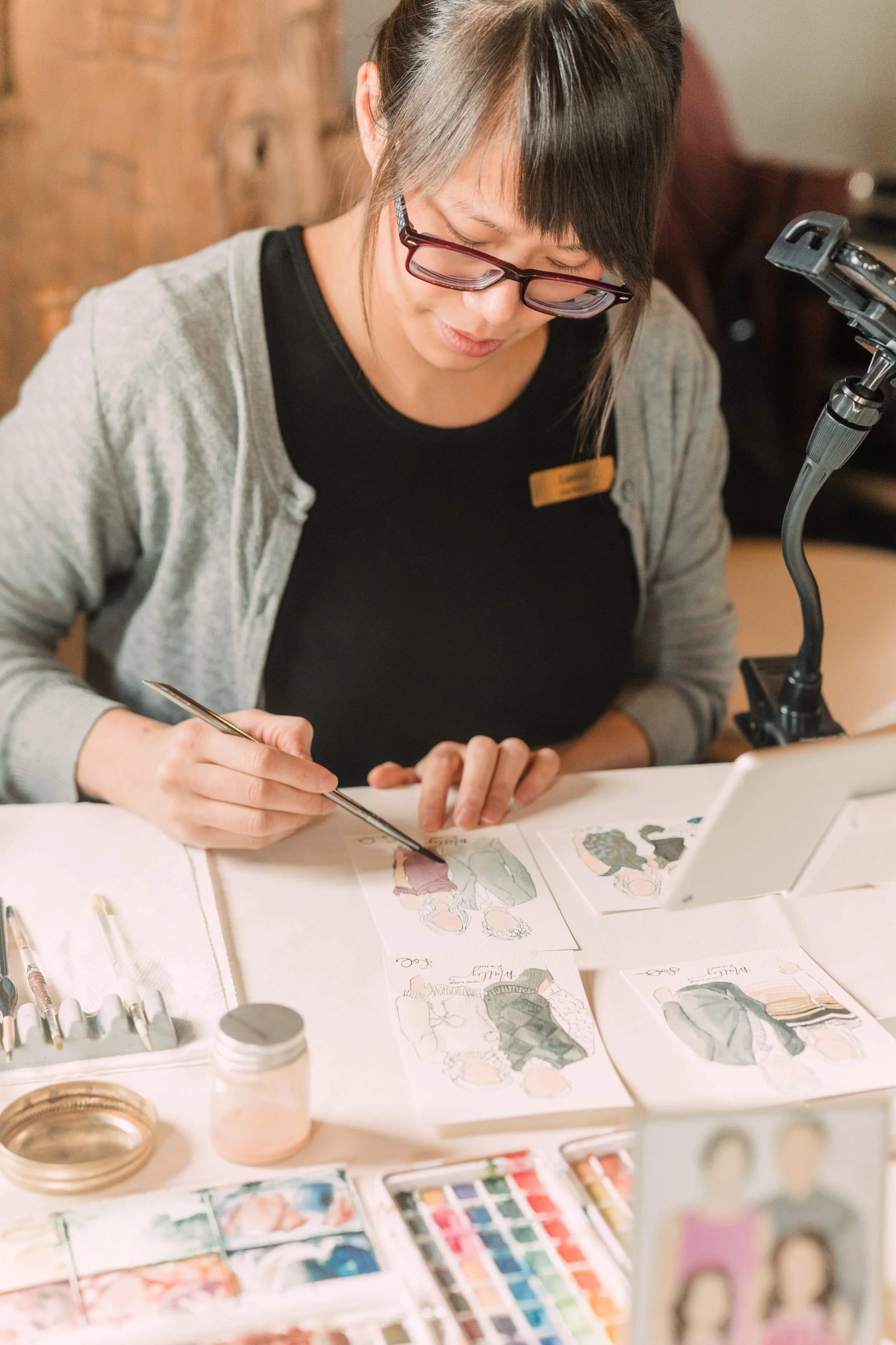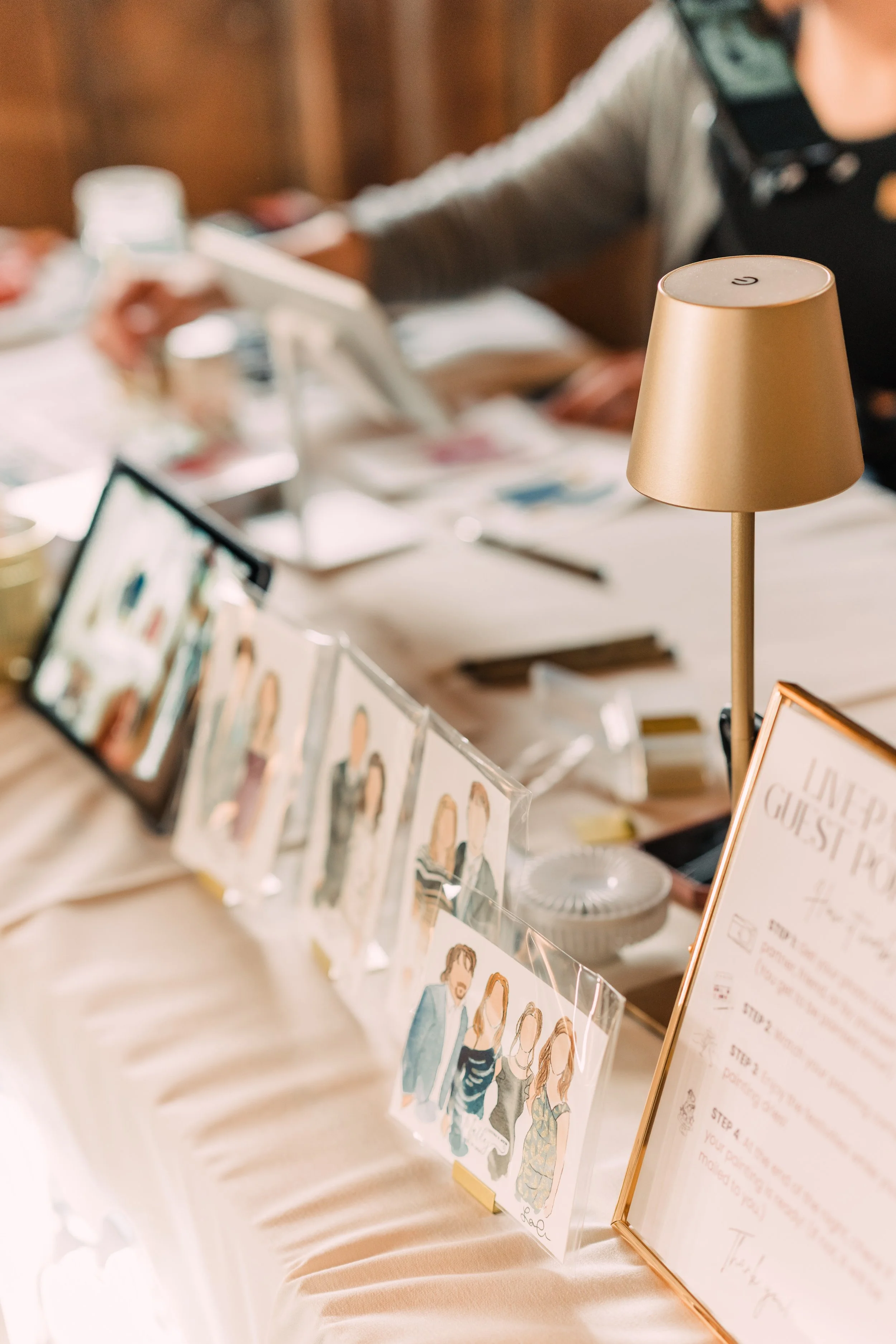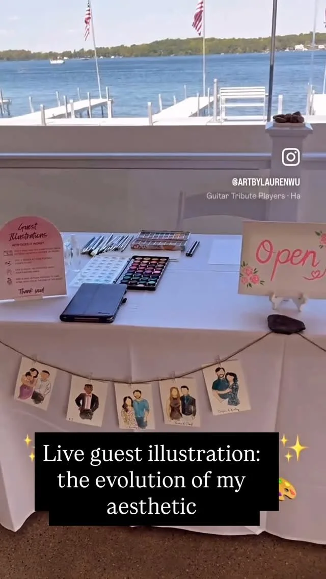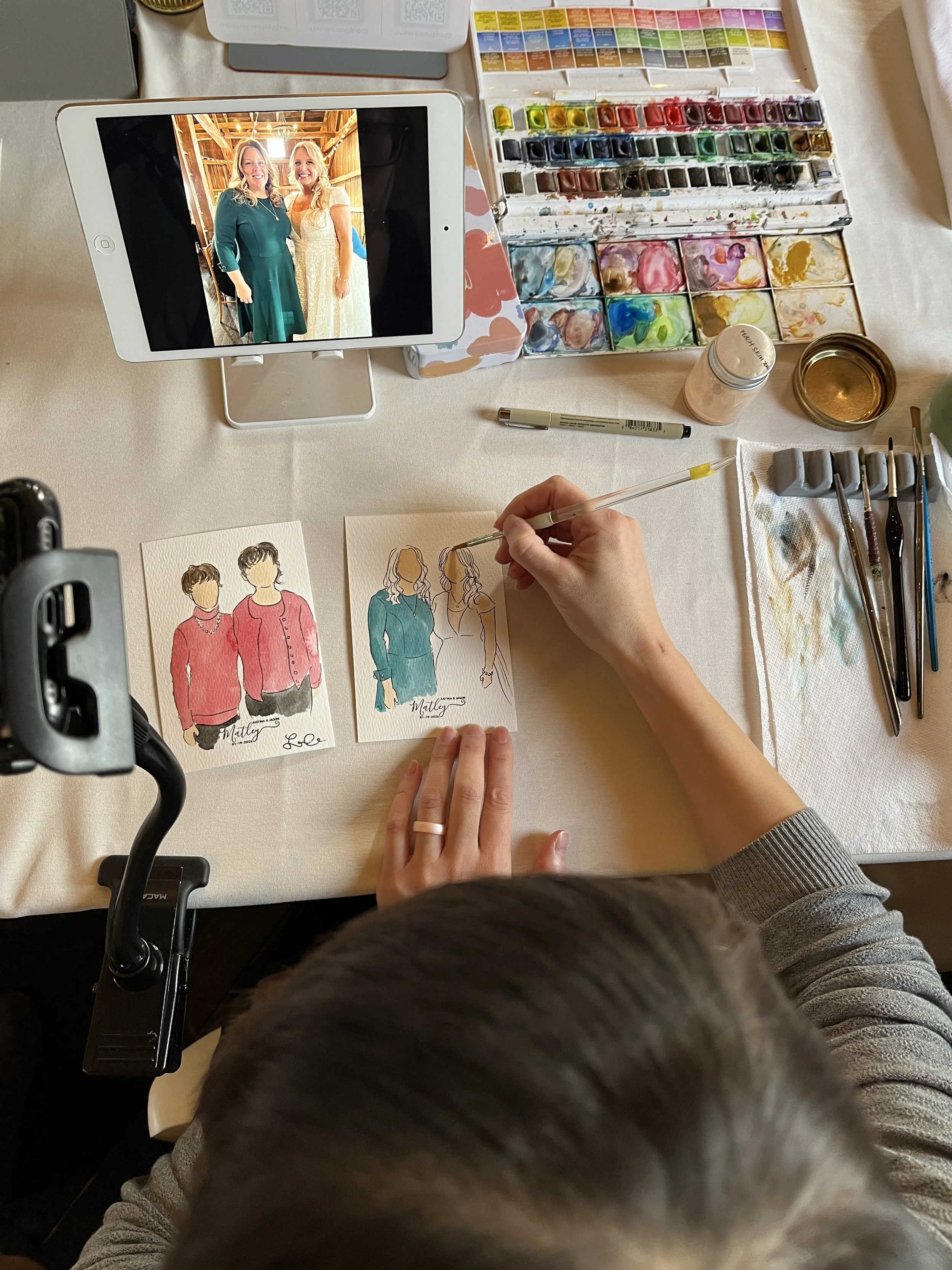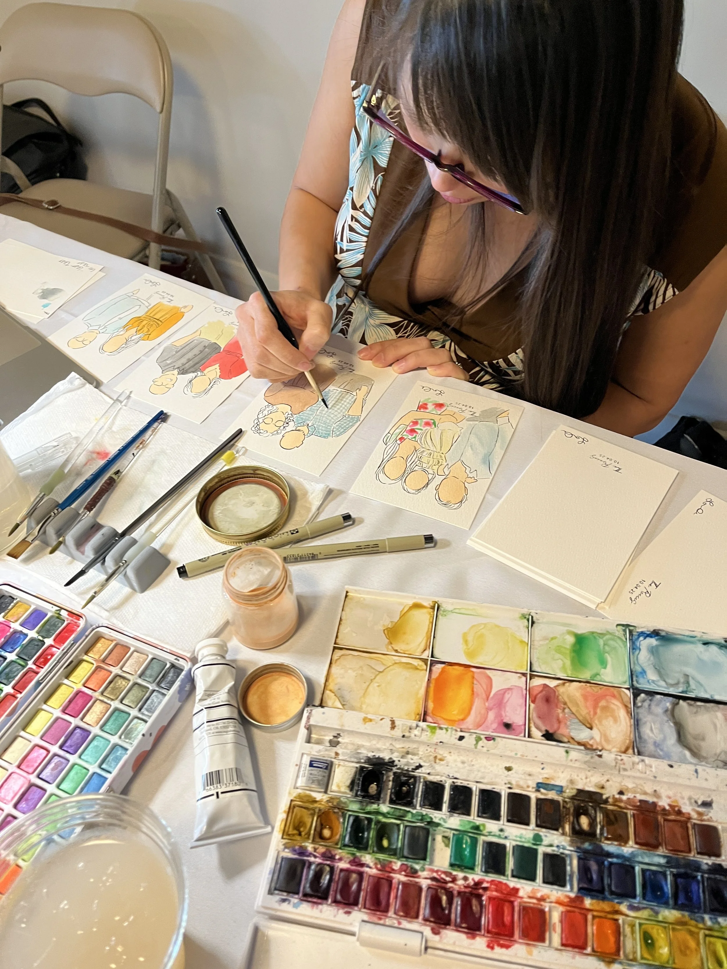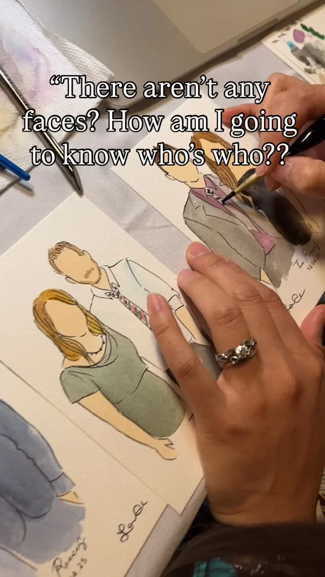 As a live guest illustrator, I provide an exclusive, interactive experience in which your family and friends become works of art. I paint watercolor guest portraits on-the-spot, a truly delightful way to entertain your guests.
